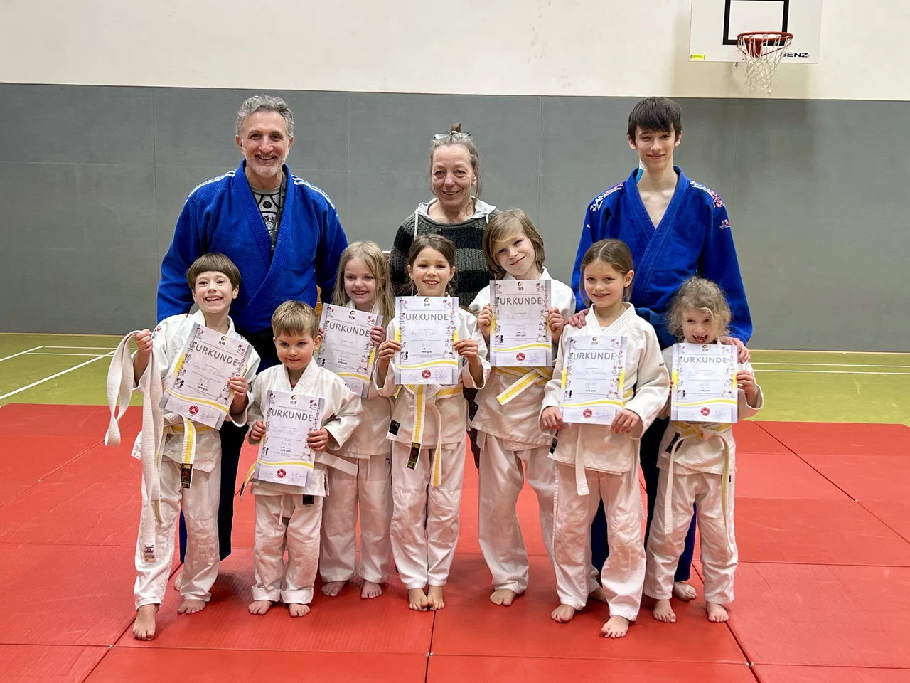 Am Montag, den 15.12.2025 hat unsere Abteilungsleiterin Gesine Kuhlmann 7 unserer Judo Kinder zum Weiss-Gelben Gürtel (8.Kyu) geprüft.